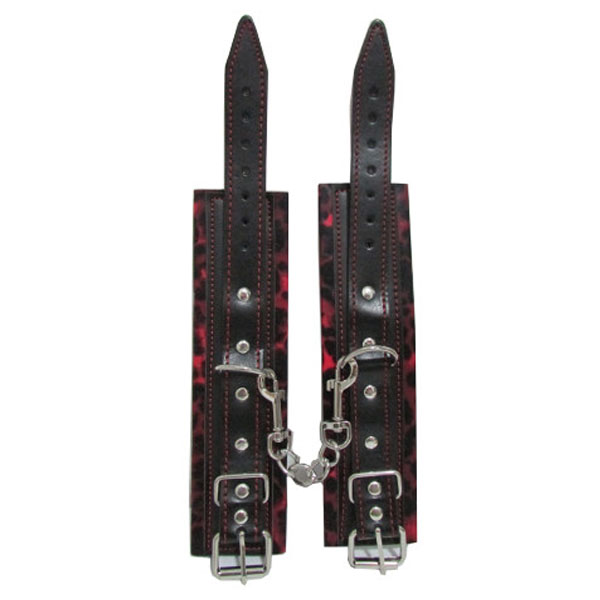 Lisice za ruke sa kraćim lancem, leopard crveni dezen, napravljene od veštačke kože.
