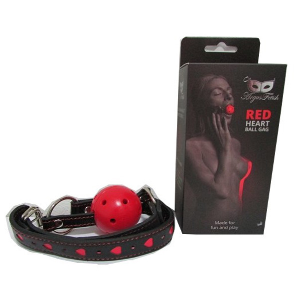 Crvena fetiš kugla za usta napravljena od veštačke kože sa utisnutim crvenim srcima. Kugla je napravljena od plastike sa rupama. Prečnik kugle 4 cm.