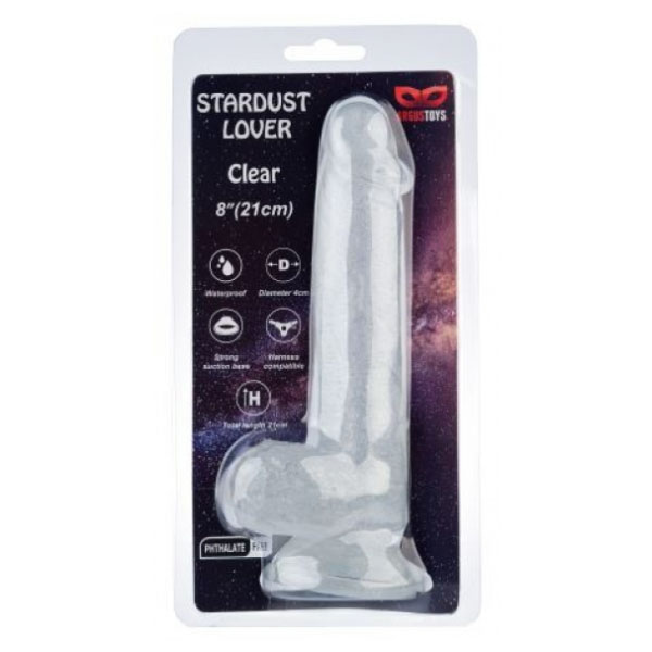 Realističan dildo izrađen od mekanog i veoma savitljivog jelly silikona, u providno beloj boji sa šljokicama. Ima testise i vakuum postolje, pa ga možete zalepiti na bilo koji glatku površinu.